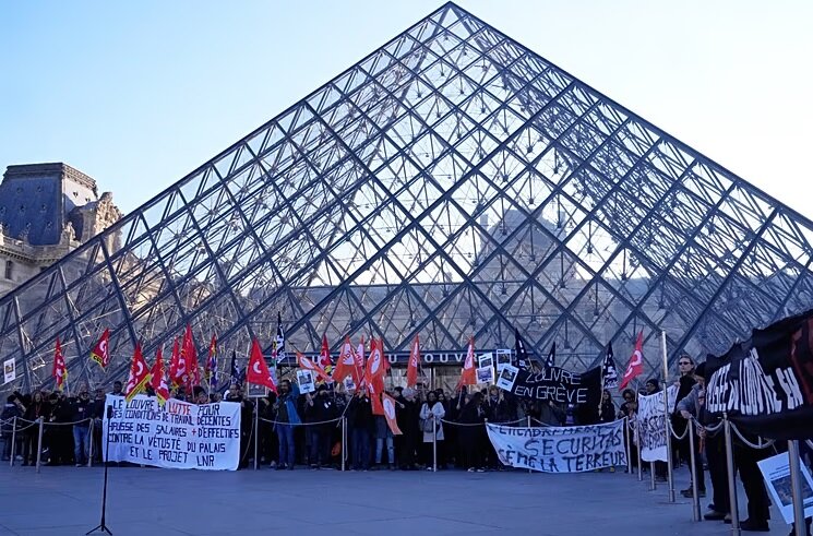 کارکنان با در دست داشتن پرچم، بنر و پلاکارد، ورودی مشهور هرم شیشه‌ای «لوور» را مسدود کردند.